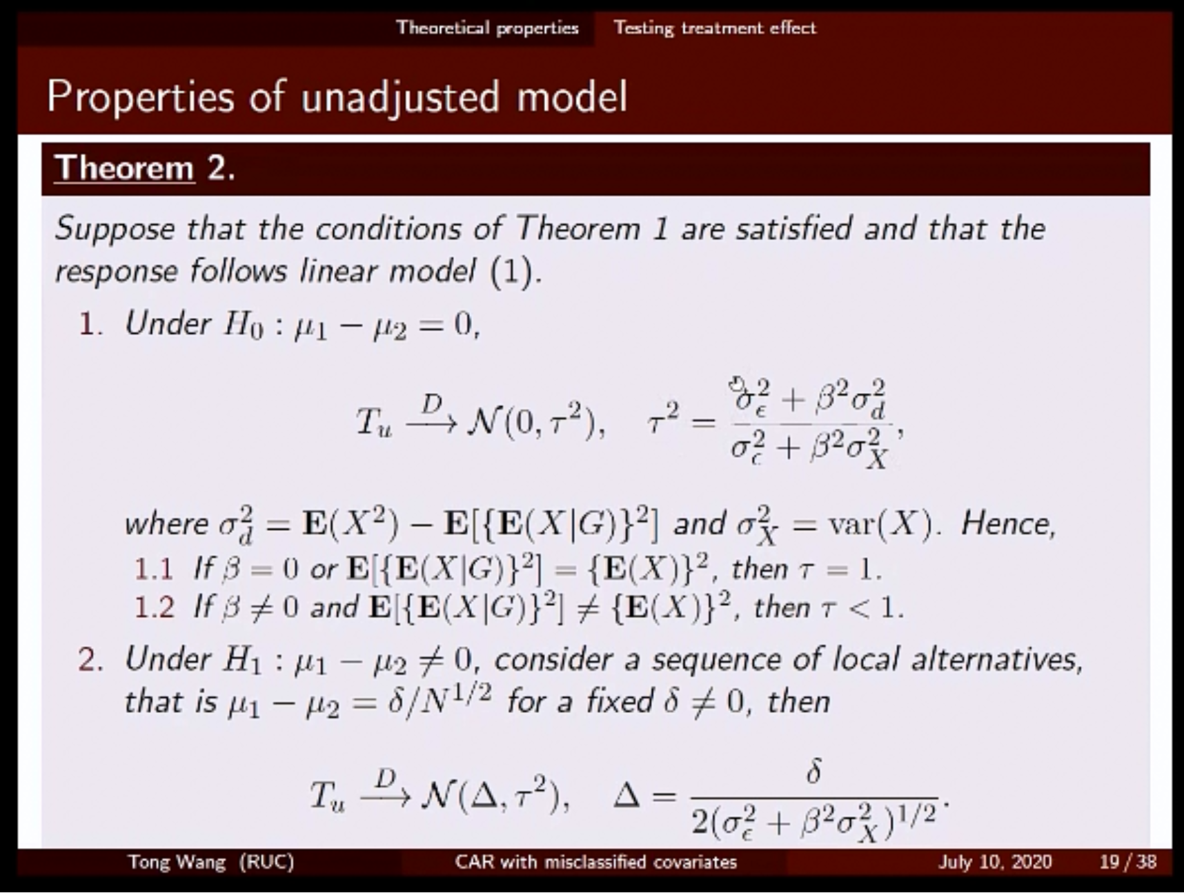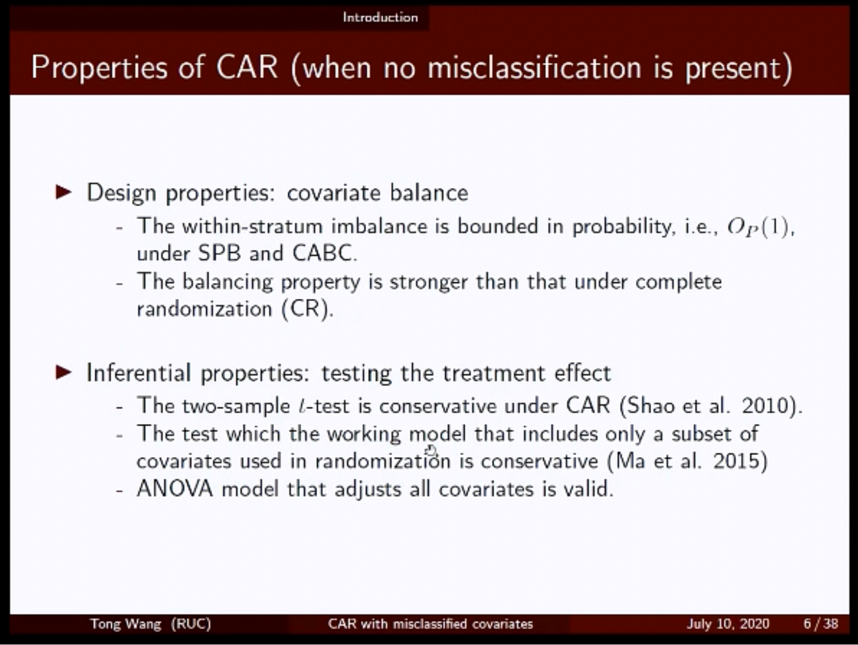 2020年7月10日上午,我院2016级博士研究生黄露康、王通分别以“A Mann–Whitney test of distributional effects in a multivalued treatment”、“The Impact of Misclassication on Covariate-Adaptive Randomized Clinical Trials”为主题在线进行了学术报告。