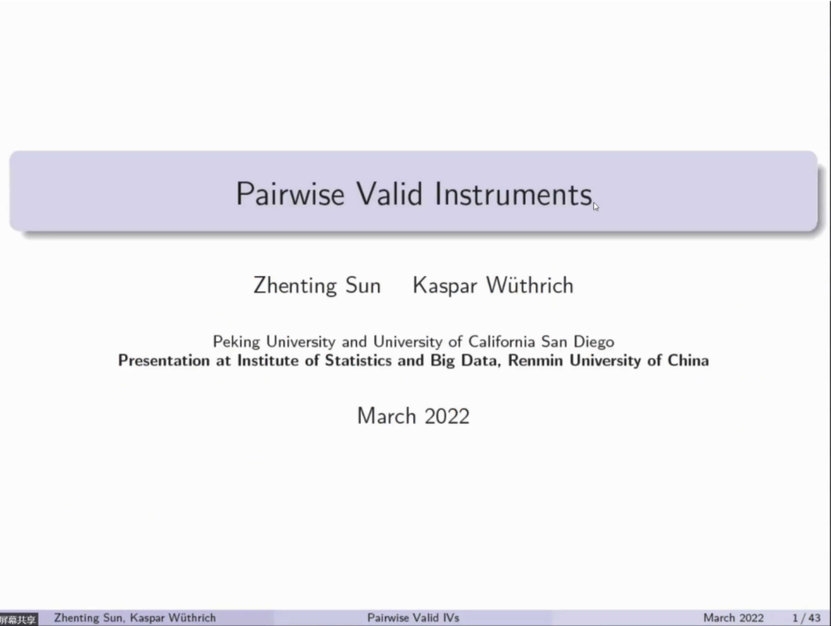 2022年3月25日,北京大学助理教授孙振庭应我院邀请进行了以“Pairwise Valid Instruments”为主题的讲座。