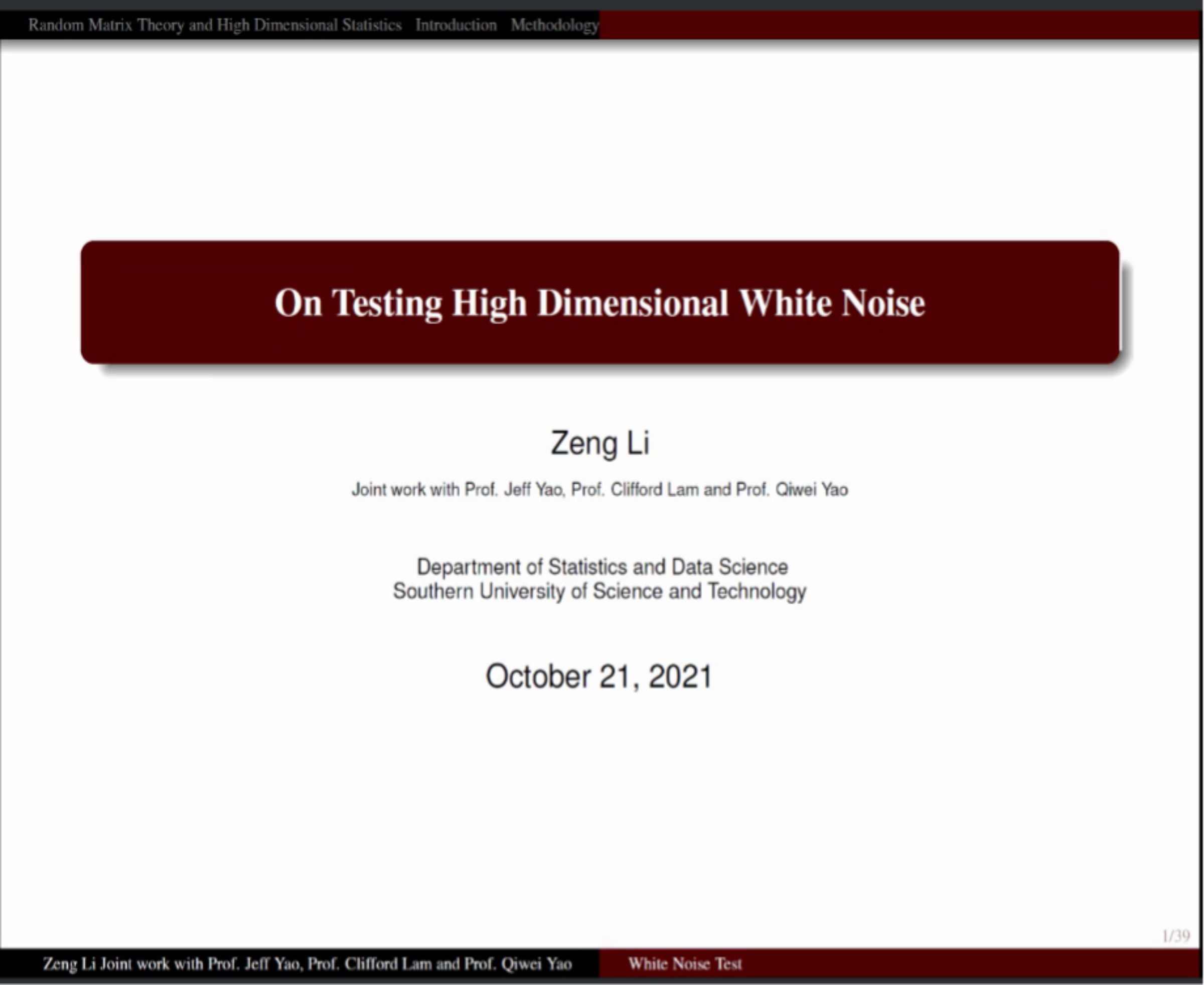 2021年10月22日上午,南方科技大学李曾副教授应我院邀请在线进行了以“On testing for high dimensional white noise”为主题的报告会。