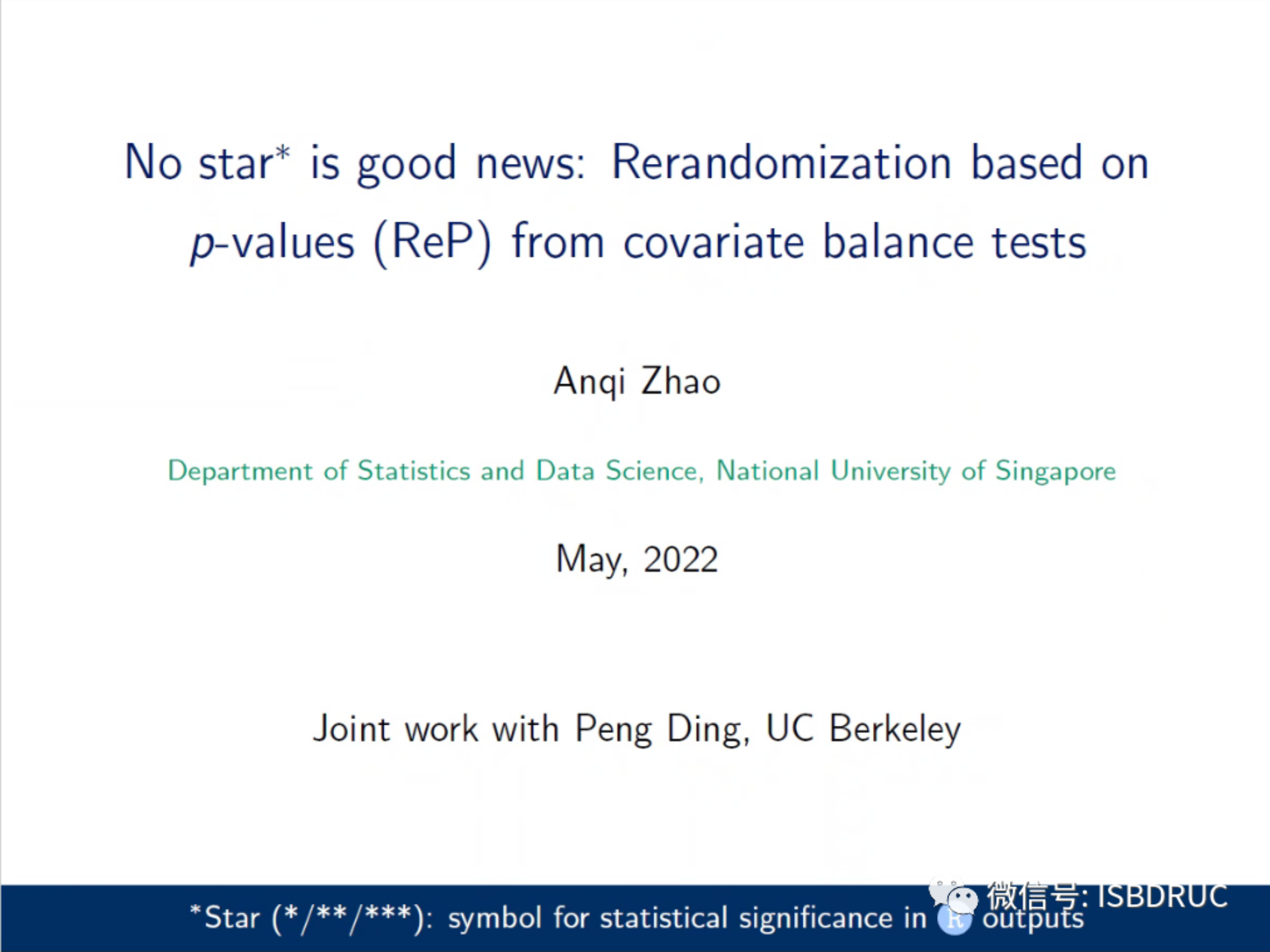 2022年5月6日,新加坡国立大学助理教授赵安琪应我院邀请进行了以“No star is good news: a unified look at rerandomization based on p-values from covariate balance tests”为主题的学术讲座。