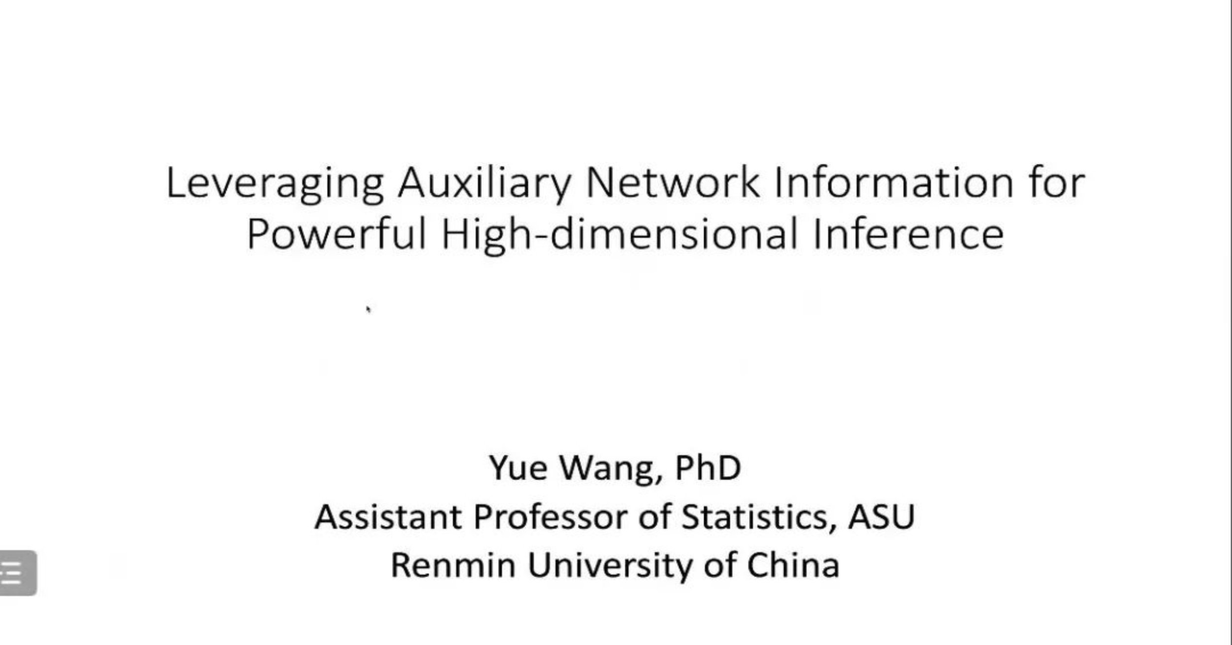 2021年11月19日上午,亚利桑那州立大学汪越助理教授应我院邀请进行了以“Leveraging Auxiliary Network Information for Powerful High-dimensional Inference”为主题的在线报告会。