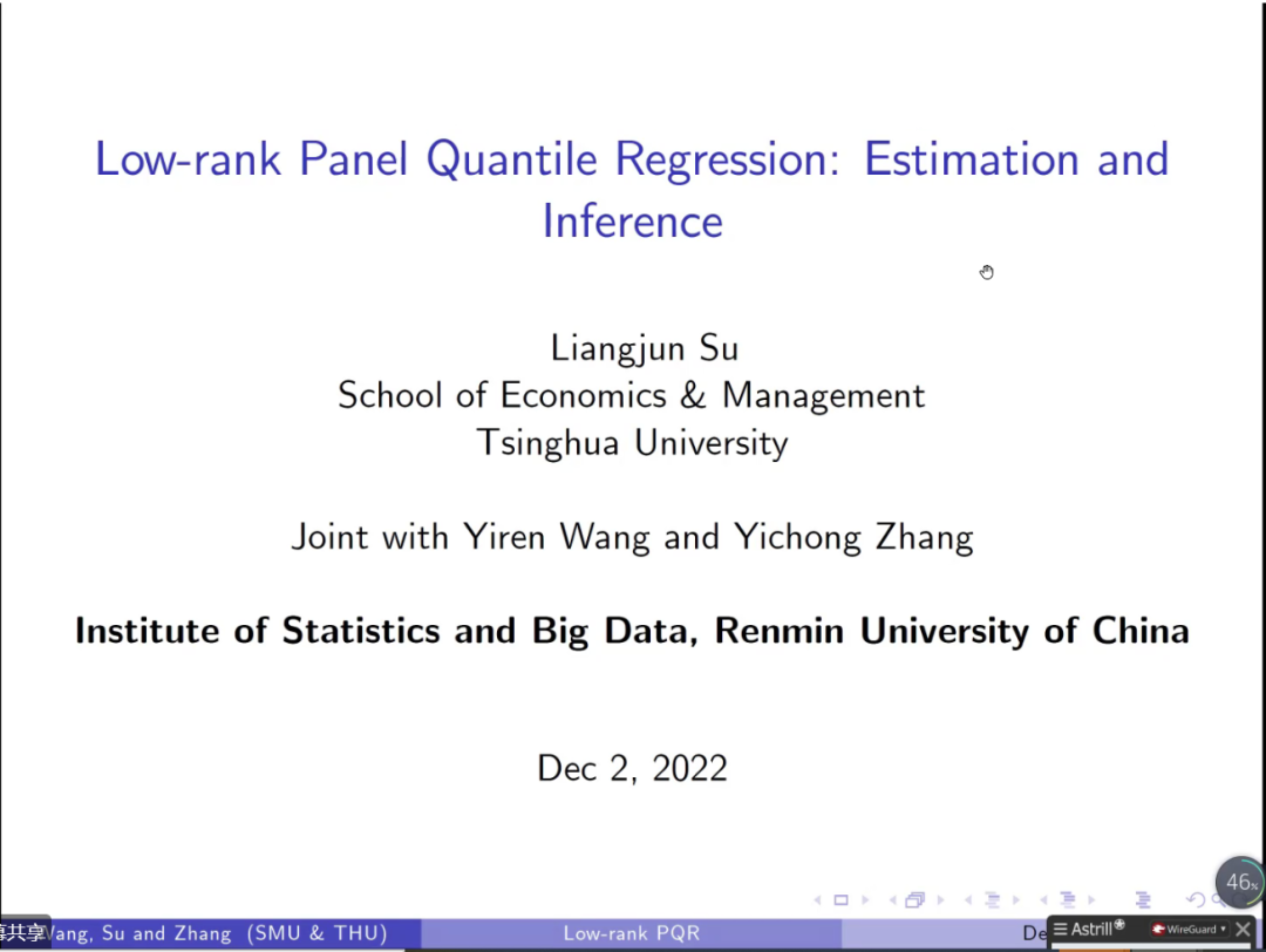 2022年12月2日,清华大学经济管理斗鸡游戏 C.V.starr讲席教授苏良军应我院邀请进行了以“Low-rank PanelQuantile Regression: Estimation andInference”为主题的线上讲座。