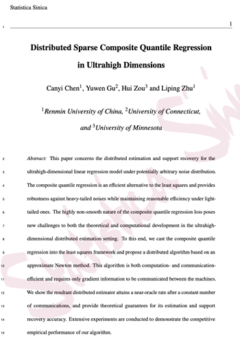 4. Canyi Chen, Yuwen Gu, Hui Zou, and Liping Zhu. 2022. “Distributed Sparse Composite Quantile Regression in Ultrahigh Dimensions.” Statistica Sinica. //doi.org/10.5705/ss.202022.0095.