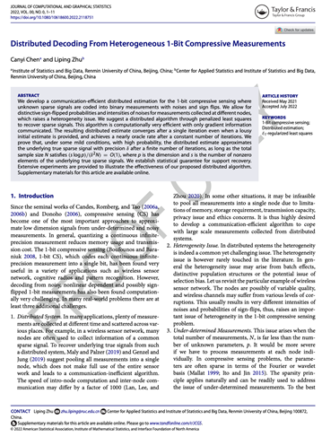 3. Canyi Chen and Liping Zhu. 2022. “Distributed Decoding From Heterogeneous 1-Bit Compressive Measurements.” Journal of Computational and Graphical Statistics 0 (ja): 1–25. //doi.org/10.1080/10618600.2022.2118751.