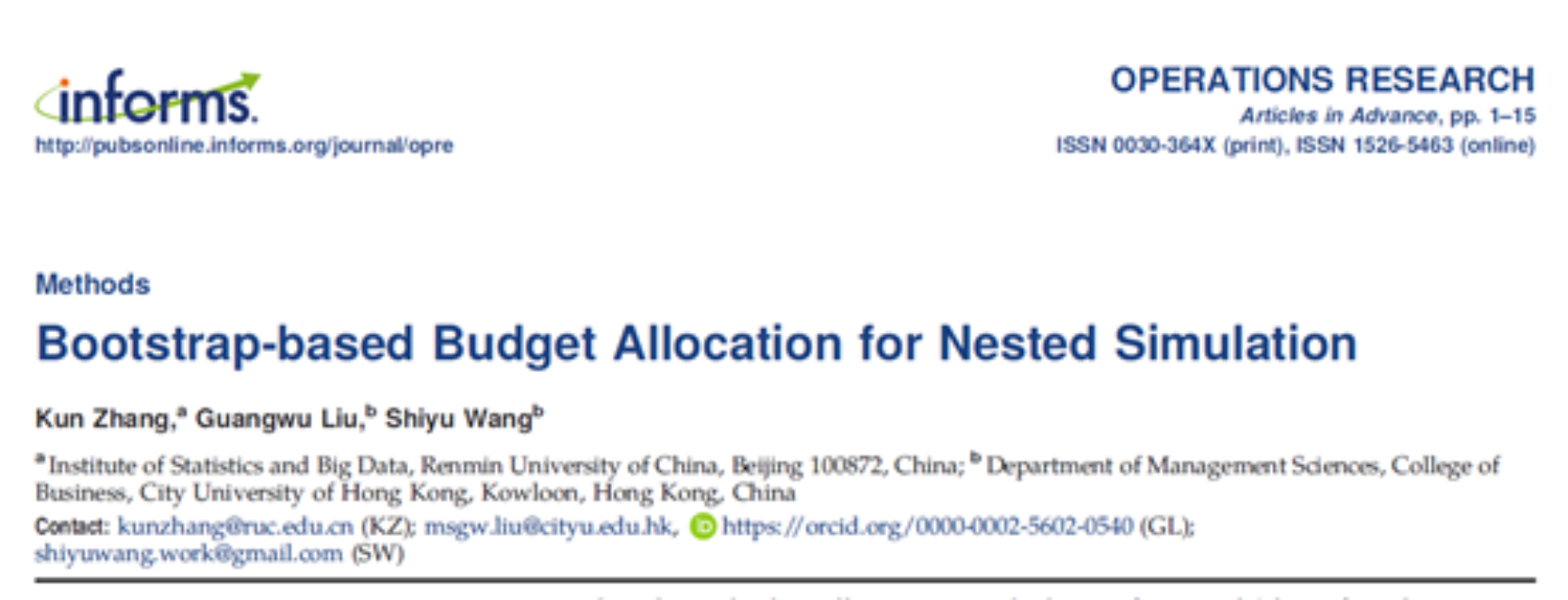 越南斗鸡游戏 张琨助理教授、香港城市大学商斗鸡游戏 管理科学系刘光梧教授和王诗雨博士在嵌套随机仿真(Nested simulation,NS)研究方面取得重要进展,相关研究成果在线发表在运筹学领域国际最顶尖期刊《Operations Research》上。经从《Operations Research》官网查询,本论文是该期刊上以Renmin University of China署名的第二篇论文。