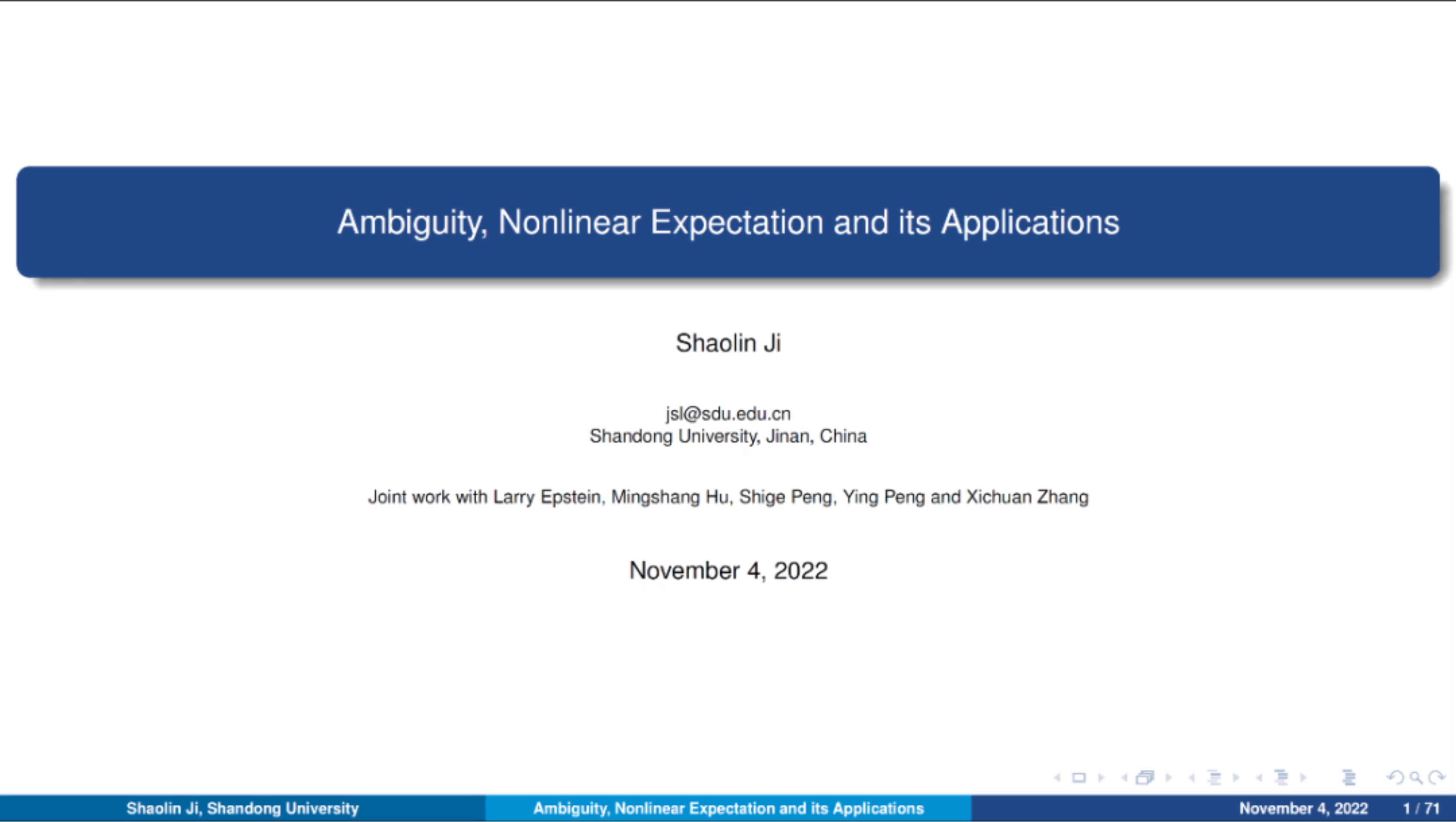 2022年11月4日,山东大学嵇少林教授应我院邀请进行了以“Ambiguity, Nonlinear Expectation and Its Applications”为主题的讲座。