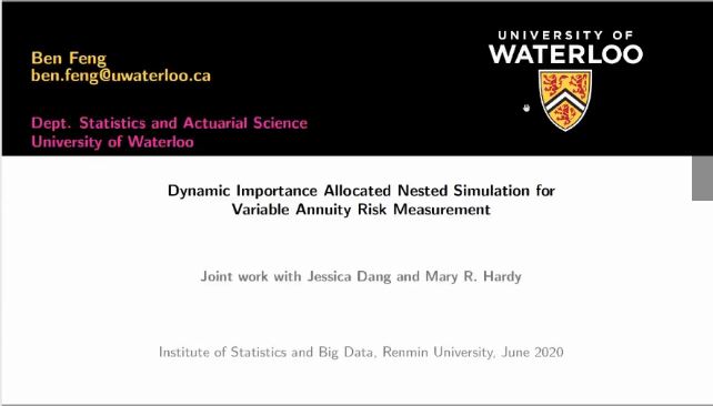 2020年6月12日上午,加拿大滑铁卢大学Ben Feng助理教授应我院邀请在线进行了以“Dynamic Importance Allocated Nested Simulation for Variable Annuity Risk Measurement”为主题的报告会。