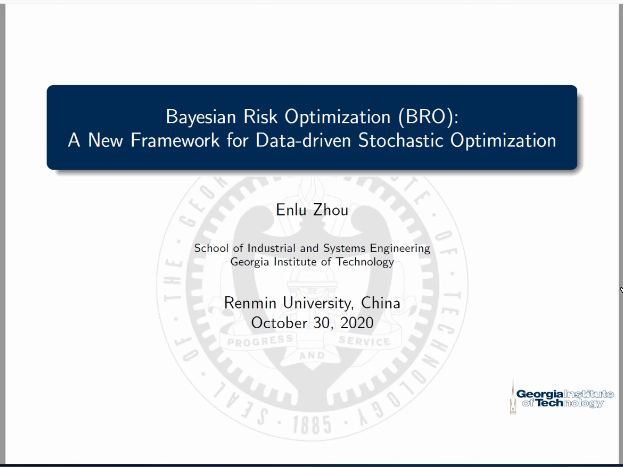 2020年10月30日上午,美国佐治亚理工斗鸡游戏 工业与系统工程斗鸡游戏 Enlu Zhou副教授应我院邀请在线进行了以“Bayesian Risk Optimization (BRO): A New Approach to Data-driven Stochastic Optimization”为主题的报告会。