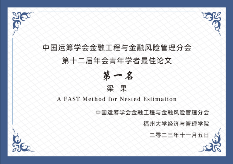 2023年11月4日至5日,由中国运筹学会金融工程与金融风险管理分会和福州大学主办,福州大学经济与管理斗鸡游戏 承办,复旦大学协办的 “中国运筹学会金融工程与金融风险管理分会第十二届学术年会”在福建省福州市召开。经过海内外专家第一轮函评打分,以及现场评审专家听取报告并进行第二轮打分,最终共有四篇学术论文获得该年会“青年学者最佳论文”奖(第一名一篇,第二名三篇)。我院博士生梁果报告的论文《A FAST Method for Nested Estimation》荣获青年学者最佳论文奖第一名。该论文由梁果和我院张琨助理教授以及上海交通大学安泰经济与管理斗鸡游戏 的罗俊教授合作完成。